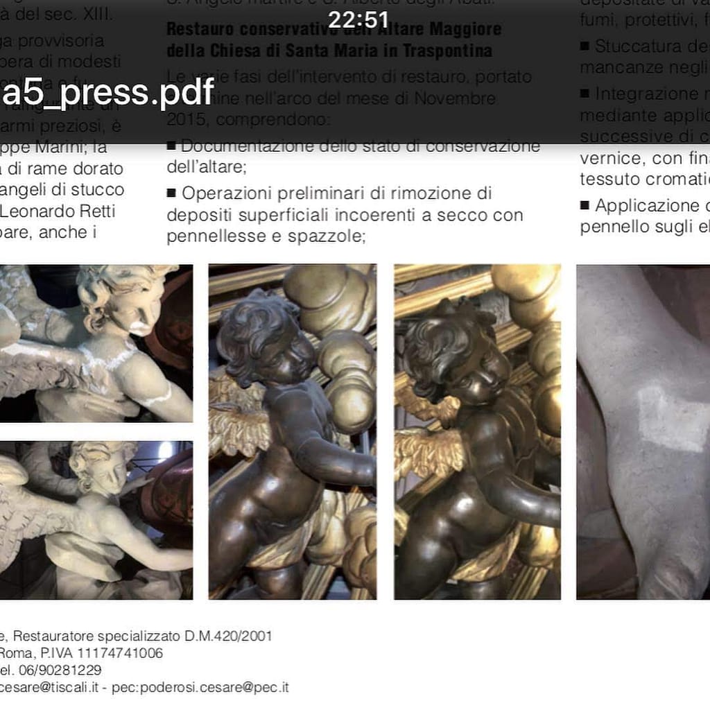 L’attività di restauro spazia dai grandi cicli pittorici (affreschi, pitture murali) ai manufatti di pregio (dorature, stucchi, ceramiche), dai materiali lapidei e metalli al legno policromo, fino a includere con sensibilità reperti archeologici e opere di arte moderna e contemporanea. Dalla maestosità dell’architettura sacra alla minuzia di un dettaglio decorativo, ogni progetto viene affrontato con la medesima dedizione.